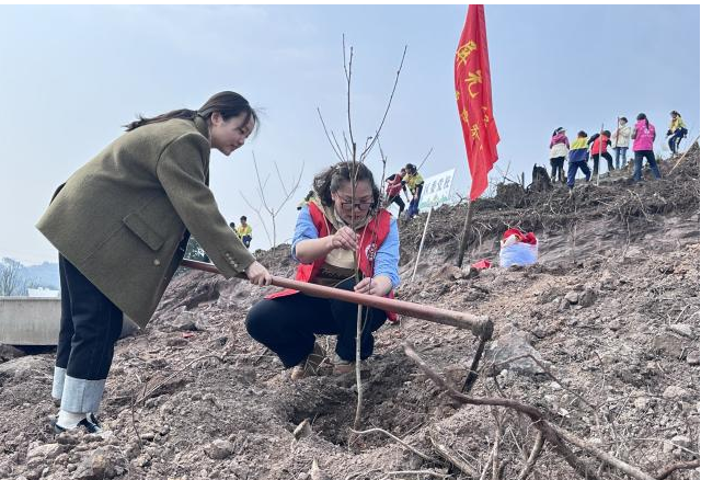 上午10时,植树活动正式启动,现场一派热火朝天的景象。干部群众三两结对,扶苗填坑、培土浇水,配合默契;技术员现场指导“三埋两踩一提苗”种植要领,确保树苗成活率。经过两小时奋战,500余棵黄桃树苗错落挺立,为荒坡“披”上了“新绿装”。
