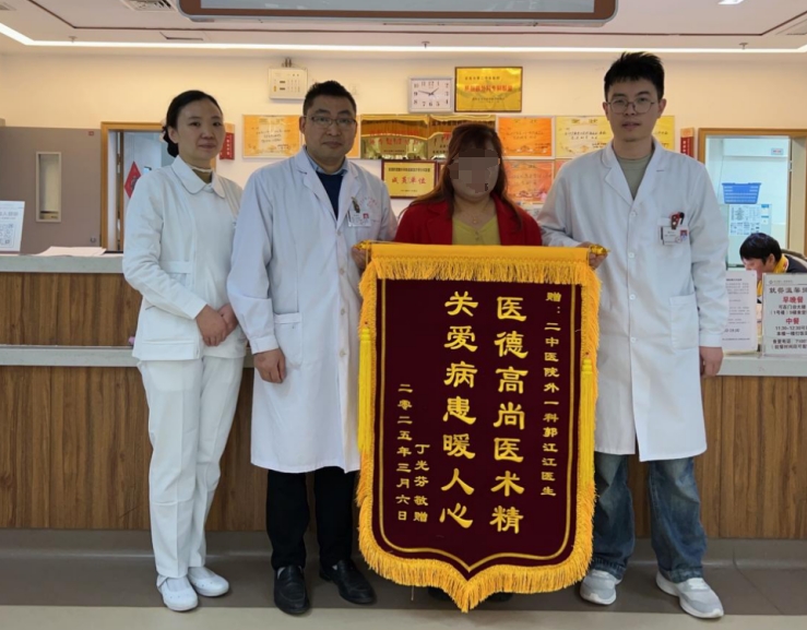 近日,宜宾市第二中医医院外一科收到患者丁女士赠送的锦旗,“医德高尚医术精 关爱病患暖人心”凝结着患者对外一科团队及郭江江医生的信任和诚挚谢意。